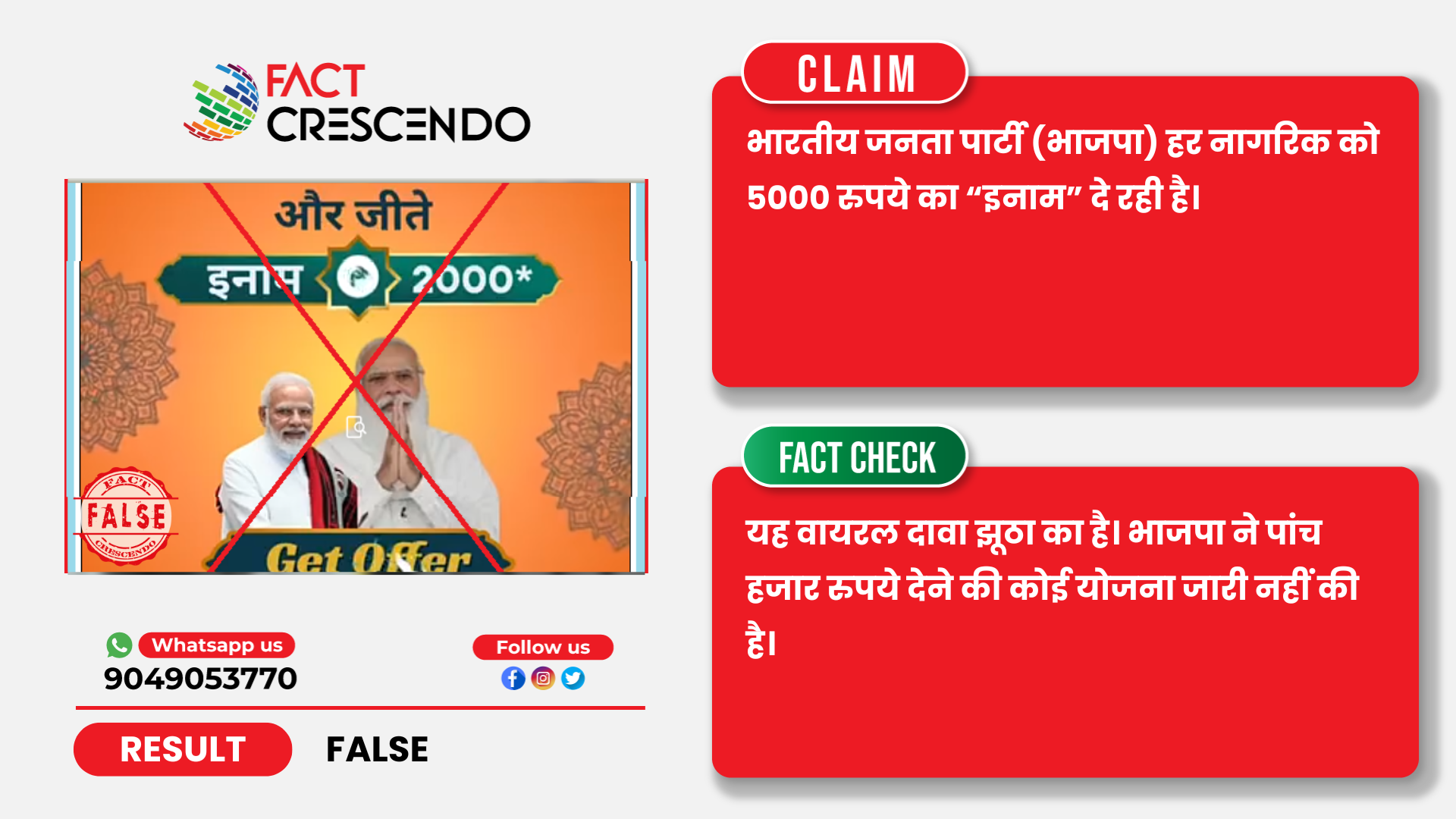 यह साफ है कि यह वायरल दावा झूठा का है। भाजपा ने पांच हजार रुपये देने की कोई योजना जारी नहीं की है। लोगों को गुमराह कर के उनके बैंक खाते से पैसे निकाल ने का यह स्कैम है।