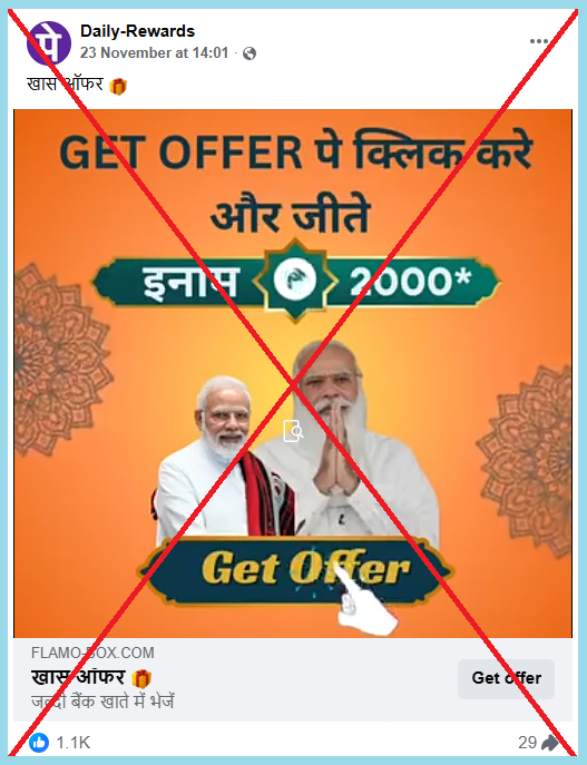 वायरल पोस्ट में प्रधानमंत्री नरेंद्र मोदी की दो तस्वीरें लगाई गई हैं। साथ में लिखा है, “बधाई हो, भारतीय जनता पार्टी की तरफ से 5000 रुपये तक की आर्थिक सहायता हर बैंक खाते में दी जा रही है। धनराशि पाने के लिए Get Offer बटन पर क्लिक करें।”