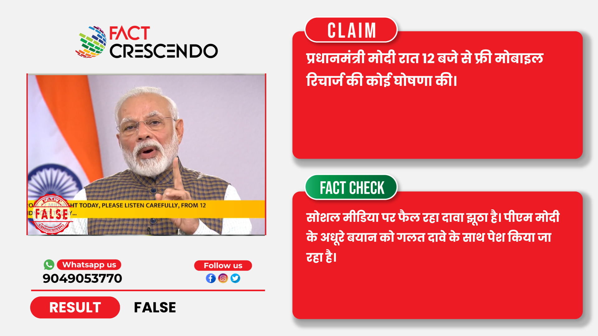 Title:क्या पीएम मोदी ने रात 12 बजे से फ्री मोबाइल रिचार्ज की घोषणा की है?