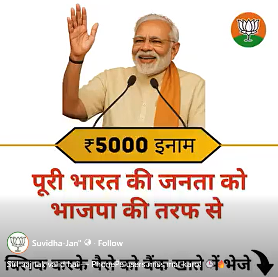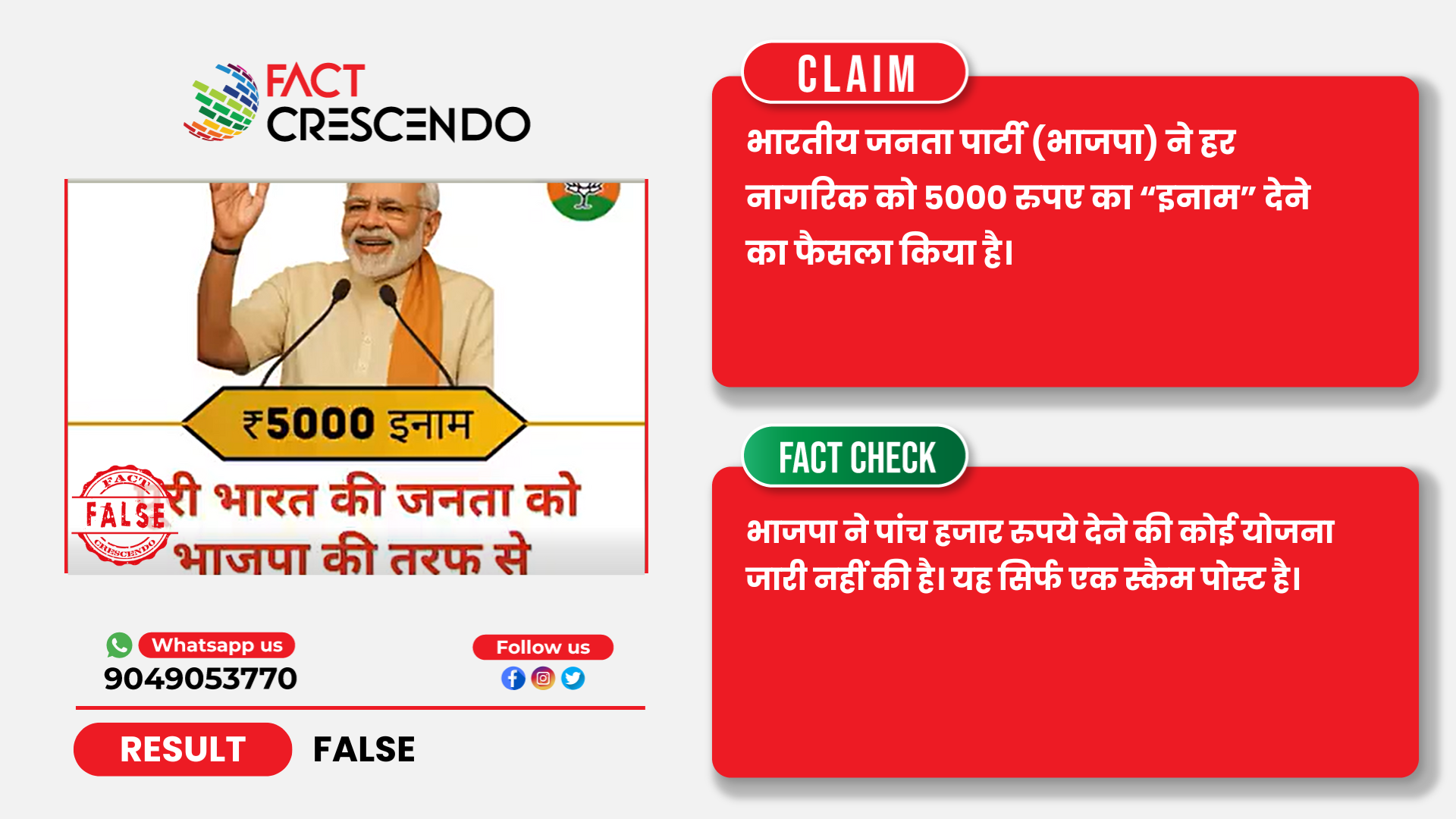 सोशल मीडिया पर वायरल इस पोस्ट में प्रधानमंत्री नरेंद्र मोदी और भाजपा का चिन्ह कमल दिखाए देता है। साथ में लिखा है कि, “पूरी भारत की जनता को भाजपा की तरफ से रू. 5000 का इनाम।”