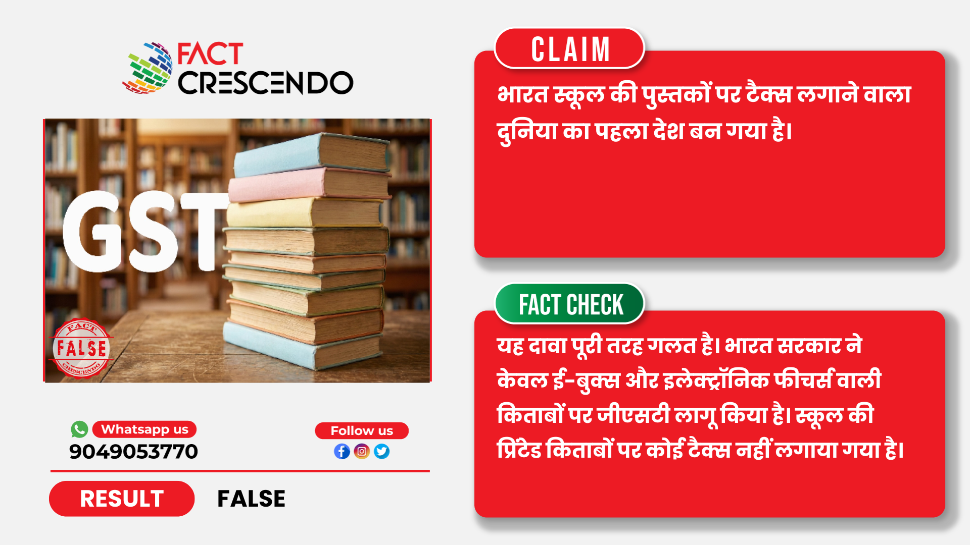 तथ्यों के जांच से यह स्पष्ट है कि वायरल दावा झूठा है। भारत सरकार ने केवल ई-बुक्स और इलेक्ट्रॉनिक अटैचमेंट वाली किताबों पर जीएसटी लगाया है, स्कूल की प्रिंटेड किताबों पर नहीं। यह झूठा दावा कई सालों से वायरल हो रहा है।