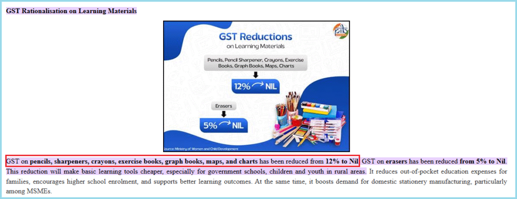 सर्च में आगे बढ़ने पर पीआईबी का 20 सितंबर 2022 का जीएसटी सुधार पत्र भी मिला, जिसमें कहा गया था कि “शिक्षा का खर्च कम करने के लिए नक्शे, पेंसिल, रबर और किताबें जैसी आवश्यक शिक्षण सामग्री पर जीएसटी 12% से घटाकर 0% किया गया है।