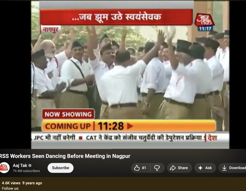 तथ्य-जांच के बाद हमने पाया कि, यह क्लिप प्री‑इंडिपेंडेंस से सम्बंधित नहीं है, बल्कि 2015 में नागपुर में आरएसएस के एक शिविर के दौरान स्वयंसेवकों के डांस का है। इस ब्लैक‑ऐंड‑व्हाइट फुटेज में आरएसएस की वेशभूषा में कई स्वयंसेवक गाना गाते, पारंपरिक वाद्य बजाते और एक साथ नाचते दिखाई देते हैं, जिसे फ़ेक और ग़लत कैप्शन के साथ शेयर किया जा रहा है।