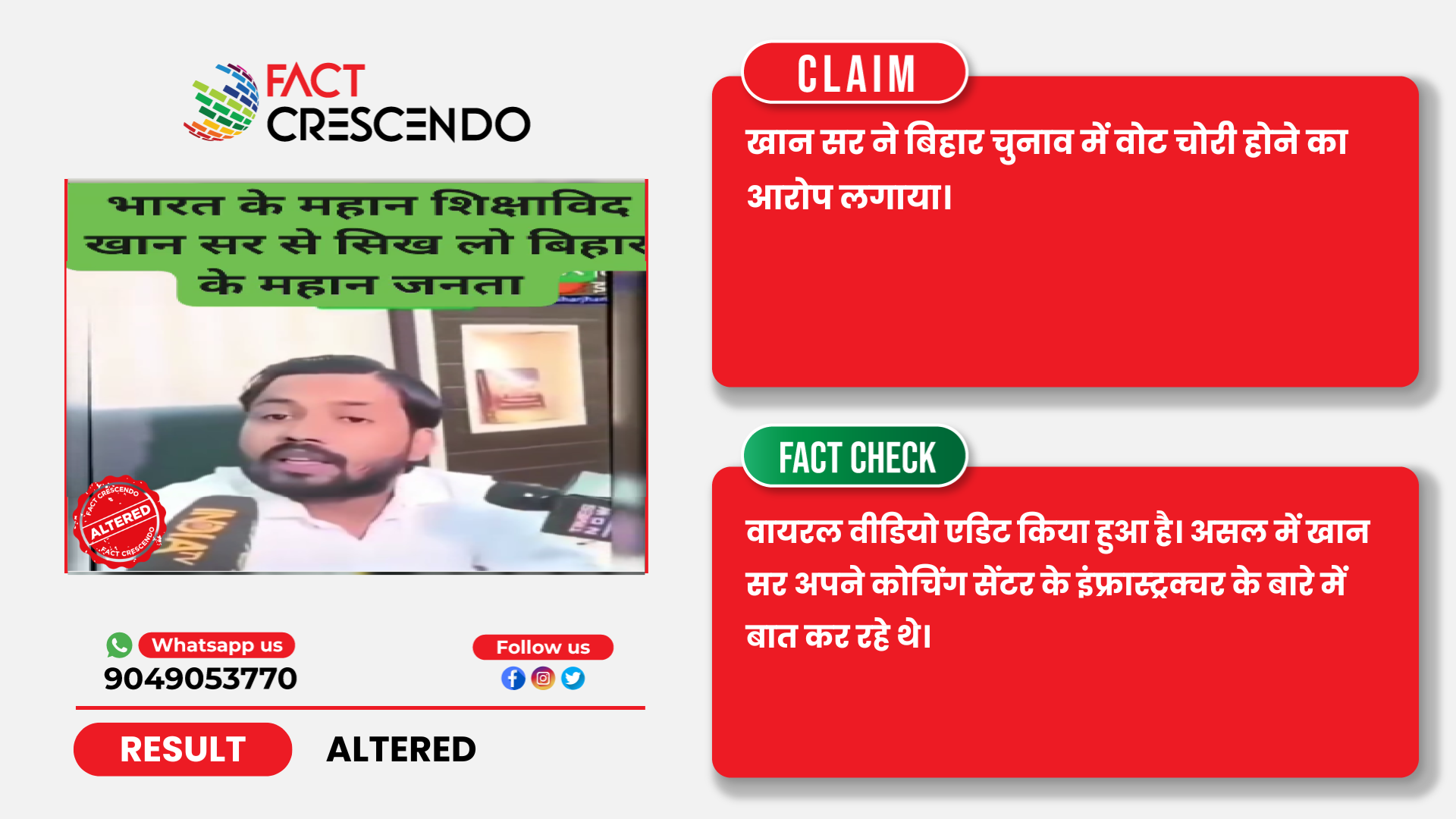 इस वीडियो के आधार पर दावा किया जा रहा है कि खान सर ने बिहार चुनाव में वोट चोरी होने का आरोप लगाया है।