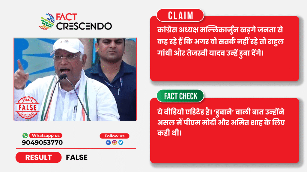 कांग्रेस अध्यक्ष मल्लिकार्जुन खड़गे का एक वीडियो सोशल मीडिया पर तेजी से वायरल हो रहा है। वीडियो के साथ दावा किया जा रहा है कि उन्होंने एक सभा में कहा कि अगर आप सतर्क नहीं रहेंगे तो राहुल गांधी और तेजस्वी यादव आपको डुबाएंगे। वायरल वीडियो करीब 20 सेकेंड का है, जिसके शुरूआती हिस्से में मल्लिकार्जुन खड़गे एक जनसभा को संबोधित करते हुए यह कहते सुनाई दे रहे हैं कि “अगर आप सतर्क नहीं रहेंगे तो राहुल जी और तेजस्वी आपको डुबाएंगे”।