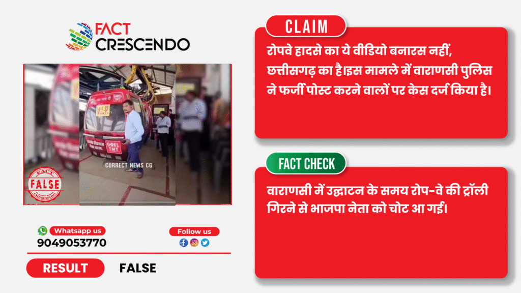 निष्कर्ष- तथ्य-जांच के बाद हमने पाया कि, रोपवे हादसे का ये वीडियो बनारस नहीं, छत्तीसगढ़ का है।इस मामले में वाराणसी पुलिस ने फर्जी पोस्ट करने वालों पर केस दर्ज किया है