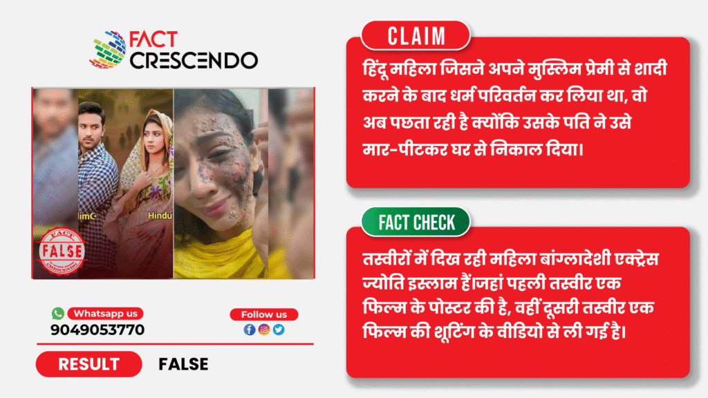 निष्कर्ष– तथ्य-जांच के बाद हमने पाया कि, एक बांग्लादेशी अभिनेत्री की तस्वीरें एक फर्जी सांप्रदायिक एंगल के साथ पेश की जा रही हैं।