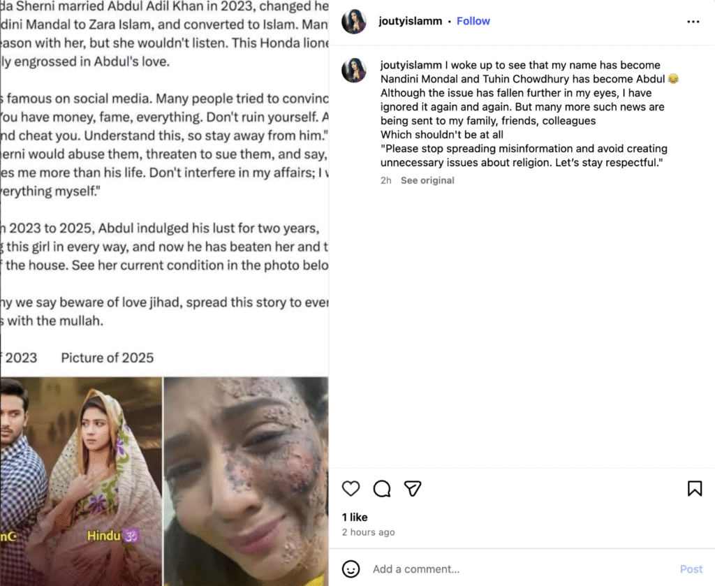 उन्होंने लिखा है- सुबह उठते ही मैंने देखा कि मेरा नाम नंदिनी मंडल और तुहिन चौधरी अब्दुल हो गया है ।हालाँकि यह मुद्दा मेरी नज़रों में और भी गिर गया है, मैंने इसे बार-बार नज़रअंदाज़ किया है। लेकिन ऐसी और भी कई खबरें मेरे परिवार, दोस्तों और सहकर्मियों को भेजी जा रही हैं । जो बिल्कुल नहीं होनी चाहिए। “कृपया गलत सूचना फैलाना बंद करें और धर्म को लेकर बेवजह के मुद्दे न बनाएँ। आइए, सम्मान बनाए रखें।”