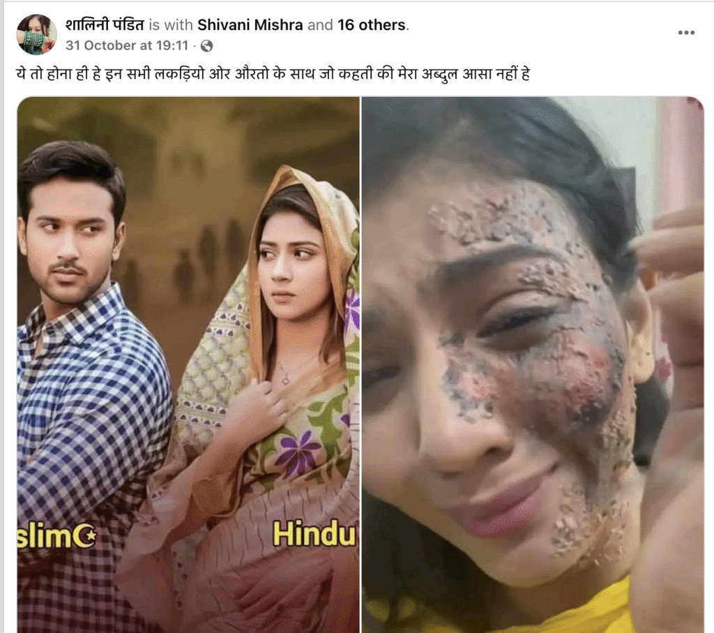 पहली फोटो में चेक प्रिंट्स वाली शर्ट पहने हुए एक आदमी और साड़ी पहने हुए एक महिला दिख रही है। आदमी को मुस्लिम और महिला को हिंदू बताया गया है। वहीं, दूसरी तस्वीर एक जले हुए चेहरे वाली महिला की है, जिसे लव जिहाद के एंगल से शेयर किया जा रहा है।