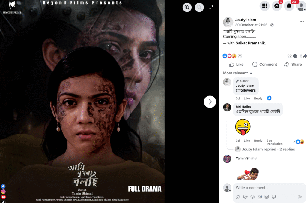 ज्योति इस्लाम ने अपने पोस्ट के साथ “#shooting” और “#banglanatok” जैसे कैप्शन दिए हैं। इसके अलावा, एक सवाल के जवाब में उन्होंने बताया कि यह शूटिंग का एक हिस्सा मात्र था। एक अन्य कमेंट में उन्होंने लिखा कि यह वीडियो “अमी नुसरत बोलची” (मैं नुसरत बोल रही हूँ) नामक एक बंगाली नाटक की शूटिंग का है।