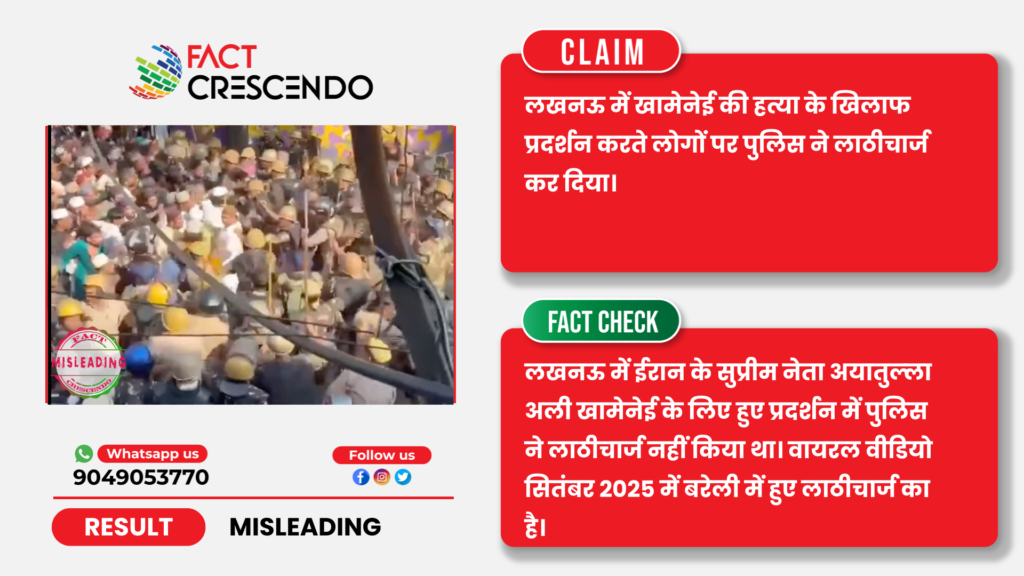 निष्कर्ष- तथ्य-जांच के बाद हमने पाया कि, लखनऊ में ईरान के सुप्रीम नेता अयातुल्ला अली खामेनेई के लिए हुए प्रदर्शन में पुलिस ने लाठीचार्ज नहीं किया था। यह वीडियो सितंबर 2025 में बरेली में हुए लाठीचार्ज के दौरान का है।