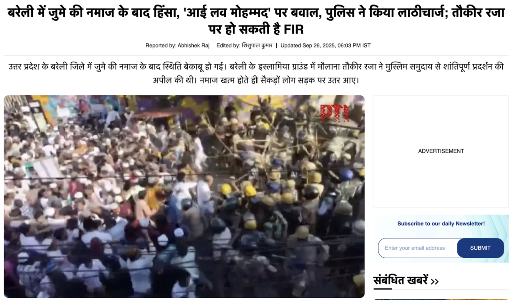 सर्च के दौरान हमें टाइम्सनाउ हिंदी की वेबसाइट पर एक खबर मिली। 26 सितंबर 2025 की इस खबर में बताया गया, बरेली में जुमे की नमाज के बाद मुस्लिम समाज के लोग सड़कों पर उतर आए, जिसके बाद कुछ हिंसक घटनाएं भी हुईं।