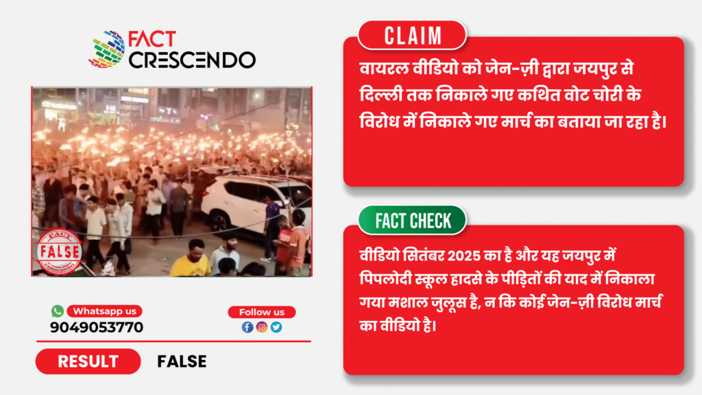 फ़ैक्ट क्रेसेंडो की पड़ताल में वायरल दावा गलत पाया गया है। सोशल मीडिया पर साझा किया जा रहा यह दावा कि वीडियो जेन-ज़ी द्वारा जयपुर से दिल्ली तक निकाले गए किसी विरोध मार्च का है, जिसमें कथित वोट चोरी के खिलाफ नारे लगाए गए—पूरी तरह भ्रामक है। जांच में सामने आया कि यह वीडियो सितंबर 2025 का है और इसमें दिखाई देने वाली रैली राजस्थान के नेता नरेश मीणा द्वारा पिपलोदी सरकारी स्कूल की छत गिरने की दुखद घटना में मारे गए बच्चों की स्मृति में आयोजित की गई थी। यह मशाल जुलूस केवल जयपुर शहर के भीतर ही निकाला गया था, न कि जयपुर से दिल्ली तक। स्पष्ट है कि इस वीडियो को राजनीतिक माहौल भड़काने और एक झूठी कथा गढ़ने के लिए भ्रामक दावे से जोड़कर फैलाया जा रहा है।