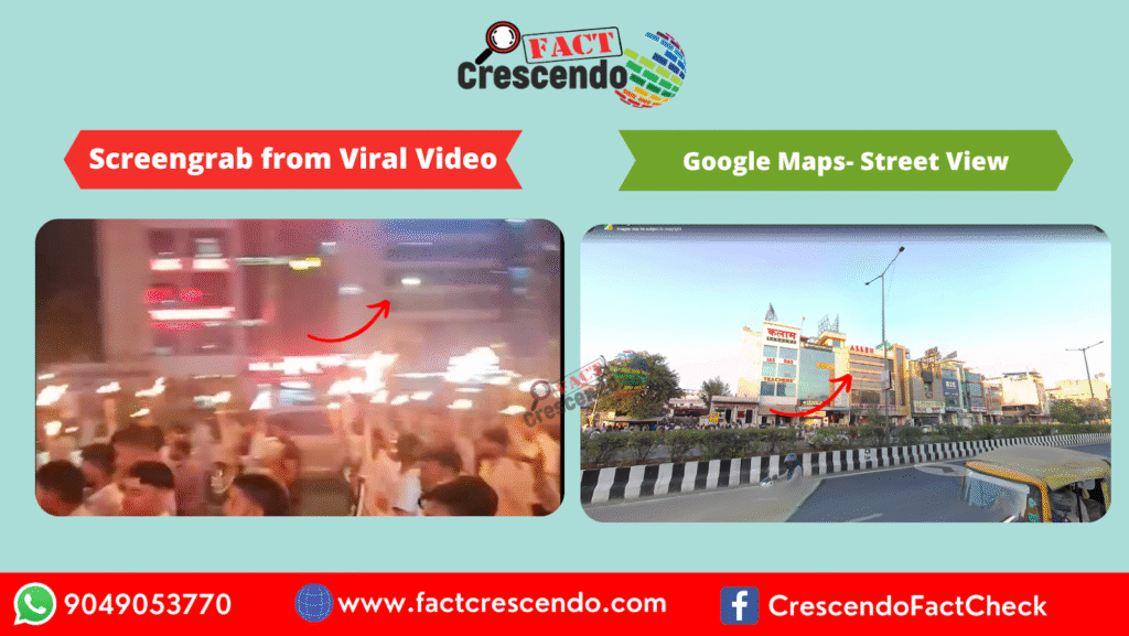 वीडियो की सटीक लोकेशन की पुष्टि करने के लिए हमने इसके एक साफ़ संस्करण को गूगल स्ट्रीट व्यू से मिलाया। कई दृश्य तत्व जैसे दुकानों के बोर्ड, सड़क के किनारे लाइटें, भवनों की संरचना, और चौराहों को देखकर और गूगल मैप्स पर ढूंढकर पता चला कि, ये प्रदर्शन जयपुर में त्रिवेणी नगर स्क्वायर से गुजर की थड़ी तक के मार्ग में आयोजित की गई थी। इससे पुष्टि होती है कि वीडियो पूरी तरह जयपुर का ही है।