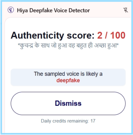 इसके साथ ही हमने देखा कि संजय दत्त की वायरल वीडियो में लिपसिंक ठीक नहीं है। इससे हमें वीडियो में एआई से छेड़छाड़ का संदेह हुआ। इसलिए हमने इसकी पड़ताल के लिए Hiya Deepfake Voice Detector टूल की मदद से सर्च किया। टूल ने वायरल वीडियो में ऑडियो को deepfake बताया।