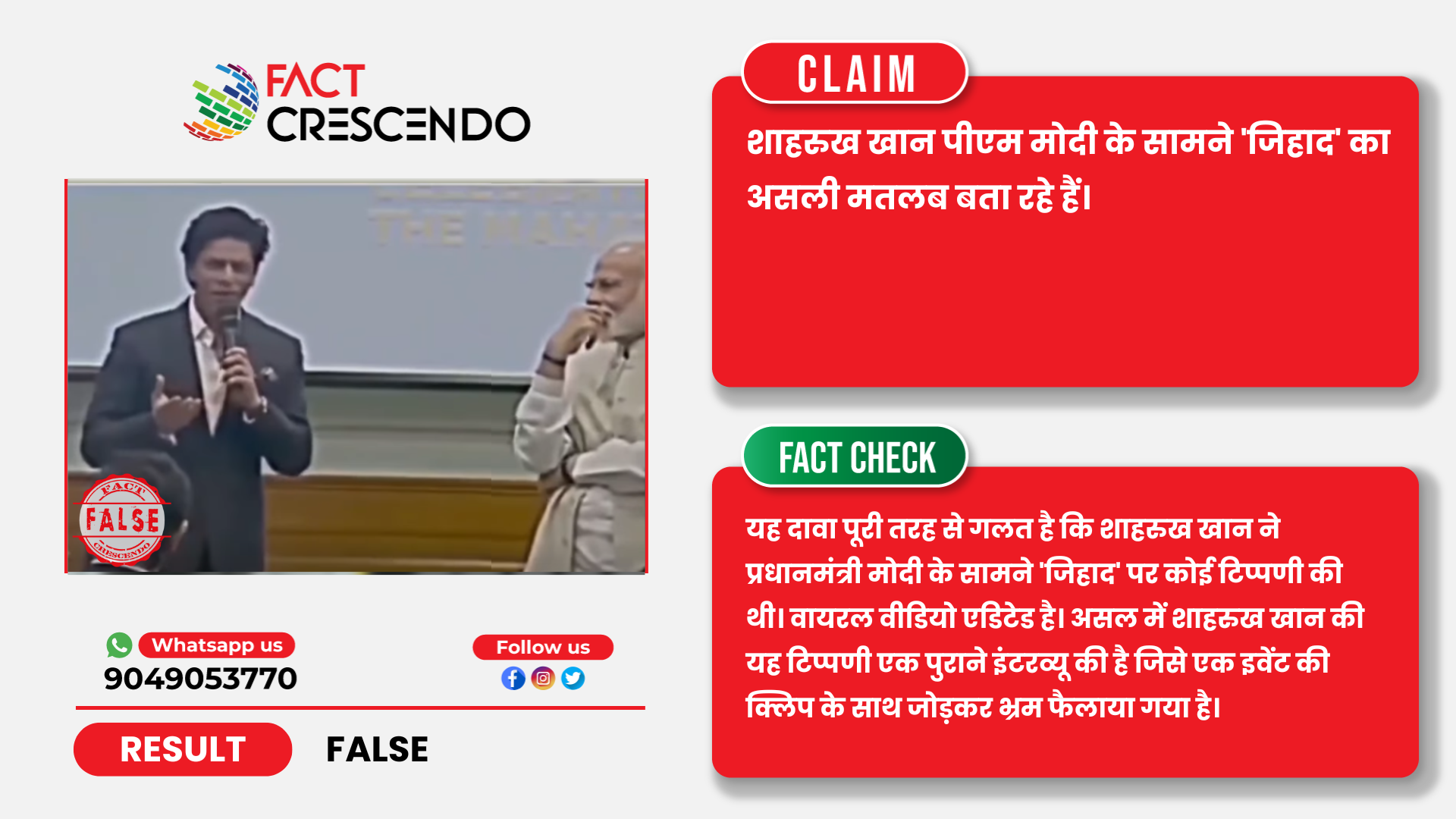 इस प्रकार से स्पष्ट हुआ जा सकता है कि शाहरुख खान द्वारा पीएम मोदी के सामने जिहाद पर कोई टिप्पणी नहीं की गई थी। बल्कि शाहरुख खान की यह टिप्पणी किसी और इवेंट की थी जिसे एक साथ मिला कर ऐसा तैयार किया गया था, जिससे यह प्रतीत हुआ कि उन्होंने पीएम मोदी के सामने जिहाद का मतलब समझाया हो।