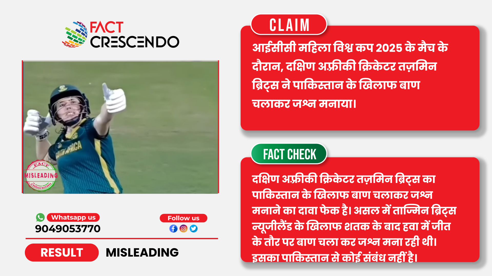 तथ्यों के जांच से यह पता चलता है कि वायरल वीडियो के साथ किया जा रहा दावा गलत है। असल में आईसीसी महिला क्रिकेट वर्ल्ड कप 2025 में दक्षिण अफ्रीका की खिलाड़ी ताज्मिन ब्रिट्स ने न्यूजीलैंड के खिलाफ शतक के बाद जश्न मानते हुए हवा में जीत के तौर पर बाण चलाया था, जिसे भ्रामक दावे से पाकिस्तान से जोड़ कर साझा किया जा रहा है।
