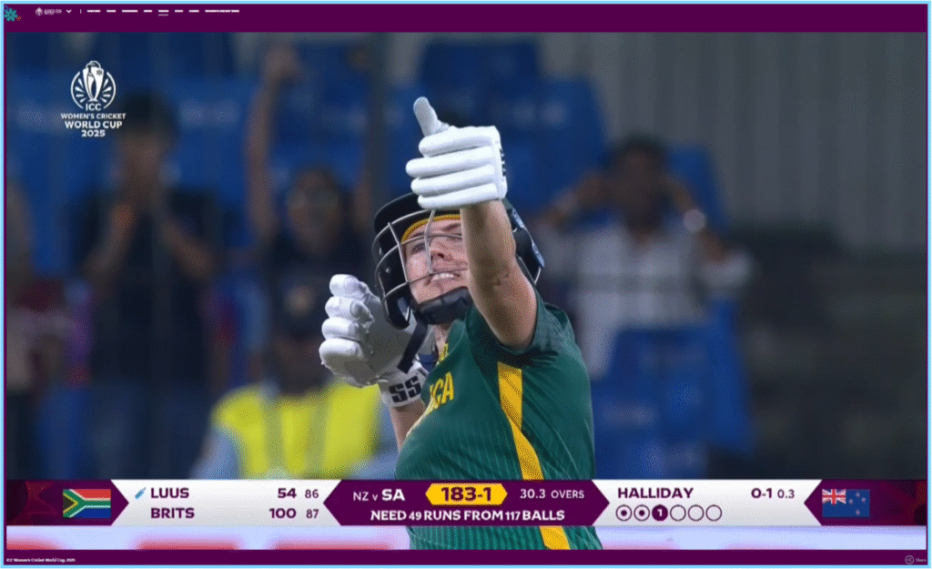 हमने जांच की शुरुआत में वायरल वीडियो से सम्बंधित कीवर्ड्स को सर्च किया। परिणाम में हमें टाइम्स ऑफ़ इंडिया की 7 अक्टूबर को छपी हुई खबर मिली। यहां दी गई जानकारी के अनुसार, दक्षिण अफ्रीका की टैजमिन ब्रिट्स ने न्यूजीलैंड के खिलाफ 2025 वर्ल्ड कप में 86 गेंदों में शतक लगाकर इतिहास रच दिया। शतक लगाने के बाद ब्रिट्स ने अपना मशहूर ‘धनुष-बाण सेलिब्रेशन’ भी किया।