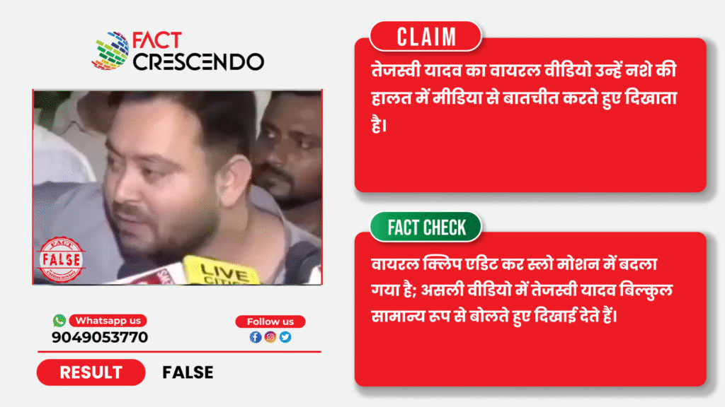फ़ैक्ट क्रेसेंडो की विस्तृत जांच में यह दावा गलत पाया गया है। वायरल वीडियो एडिटेड है और इसकी गति को कृत्रिम रूप से धीमा किया गया है, जिससे ऐसा भ्रम पैदा किया जा रहा है कि तेजस्वी यादव नशे की हालत में मीडिया से बात कर रहे थे। जबकि मूल वीडियो में उनकी आवाज, गति और हाव-भाव पूरी तरह सामान्य हैं। स्पष्ट है कि यह क्लिप संपादित कर भ्रामक दावे के साथ उनकी छवि को नुकसान पहुँचाने के उद्देश्य से फैलाया गया है।
