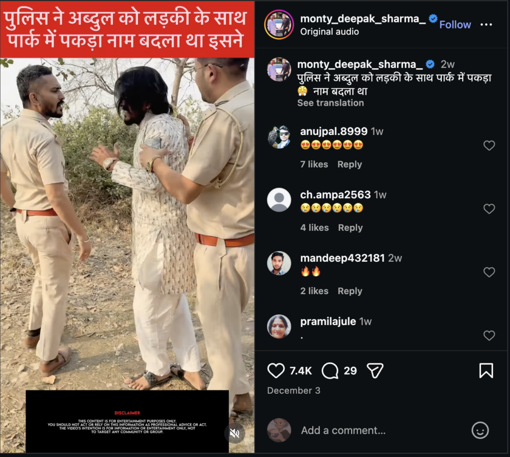 पड़ताल की शुरुआत में हमने वायरल वीडियो के तस्वीरों का रिवर्स इमेज सर्च किया, परिणाम में वायरल वीडियो हमें एक इंस्टाग्राम पोस्ट पर मिला। इसे ‘monty_deepak_sharma_‘ नाम के एक यूज़र ने 3 दिसंबर 2025 को अपलोड किया था।