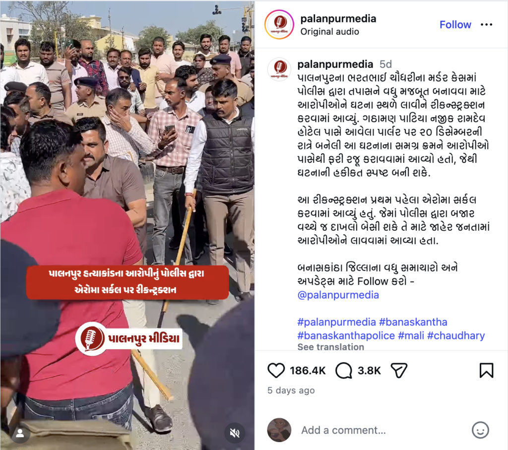 यहां पर जानकारी दी गई है कि पालनपुर में बीते 20 दिसंबर को भरत चौधरी नाम के एक शख्स की हत्या कर दी गई थी, जिसके बाद पुलिस ने जांच के दौरान आरोपियों को धटनास्थल पर ले जाकर सीन रीक्रिएट किया था।