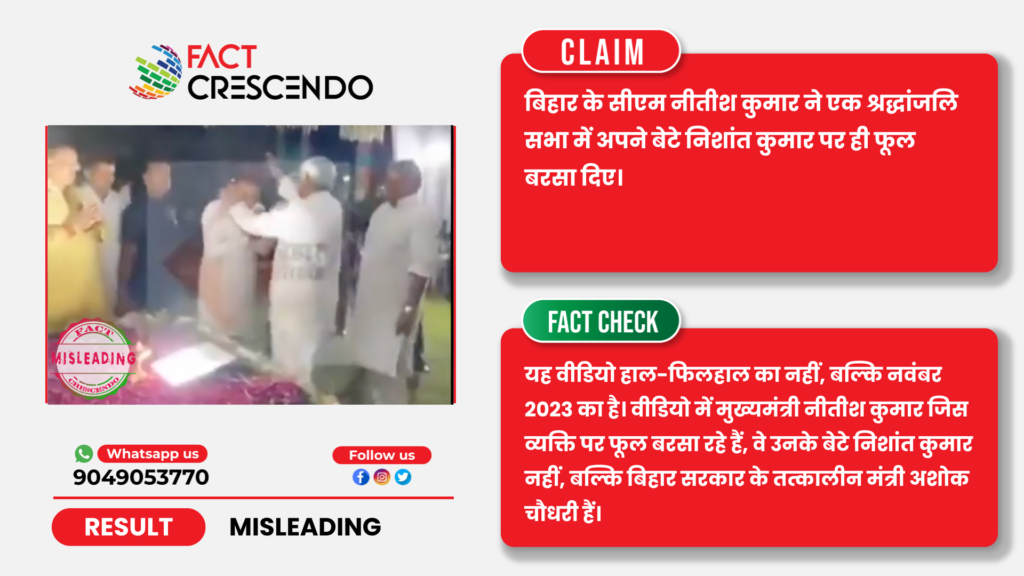 सोशल मीडिया पर बिहार के मुख्यमंत्री नीतीश कुमार का एक वीडियो तेजी से वायरल हो रहा है, जिसमें उन्हें एक श्रद्धांजलि सभा के दौरान मृत व्यक्ति की तस्वीर के बजाय, पास खड़े एक व्यक्ति के ऊपर फूल बरसाते हुए देखा जा सकता है। वीडियो के साथ दावा किया जा रहा  हैं कि नीतीश कुमार ने अपनी सुध-बुध खो दी है और उन्होंने दिवंगत व्यक्ति के चित्र पर पुष्प अर्पित करने के बजाय पास खड़े अपने ही बेटे निशांत कुमार पर फूल डाल दिए।