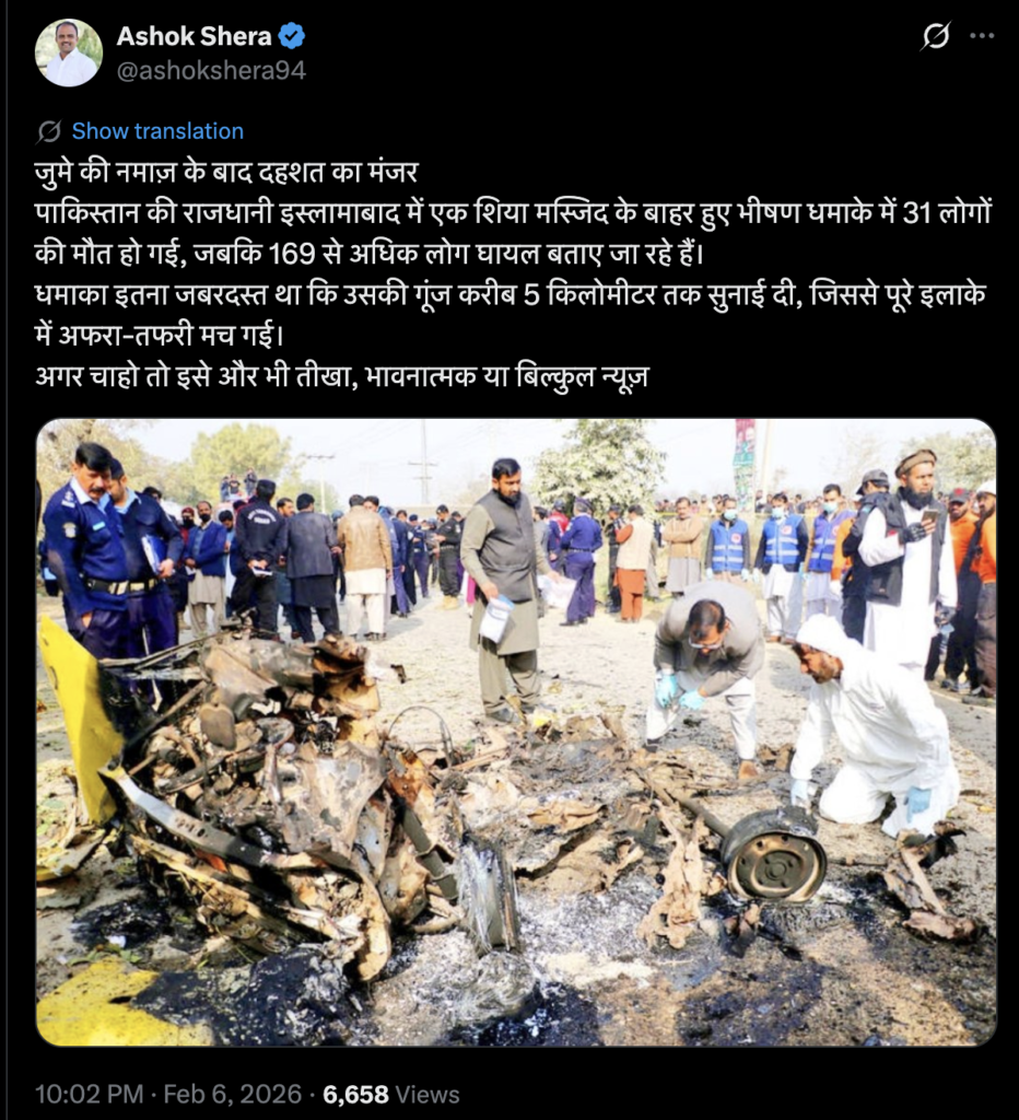 वायरल वीडियो के साथ यूजर ने लिखा है- जुमे की नमाज़ के बाद दहशत का मंजर,पाकिस्तान की राजधानी इस्लामाबाद में एक शिया मस्जिद के बाहर हुए भीषण धमाके में 31 लोगों की मौत हो गई, जबकि 169 से अधिक लोग घायल बताए जा रहे हैं। धमाका इतना जबरदस्त था कि उसकी गूंज करीब 5 किलोमीटर तक सुनाई दी, जिससे पूरे इलाके में अफरा-तफरी मच गई। अगर चाहो तो इसे और भी तीखा, भावनात्मक या बिल्कुल न्यूज़।