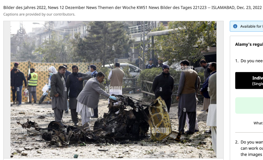 जांच में हमें फोटो एजेंसी ‘epaimages’ की वेबसाइट पर वायरल तस्वीर मिली। यहां दी गई जानकारी के अनुसार, पाकिस्तानी सुरक्षा अधिकारी 23 दिसंबर 2022 को पाकिस्तान के इस्लामाबाद में बम धमाके वाली जगह का मुआयना कर रहे हैं।
