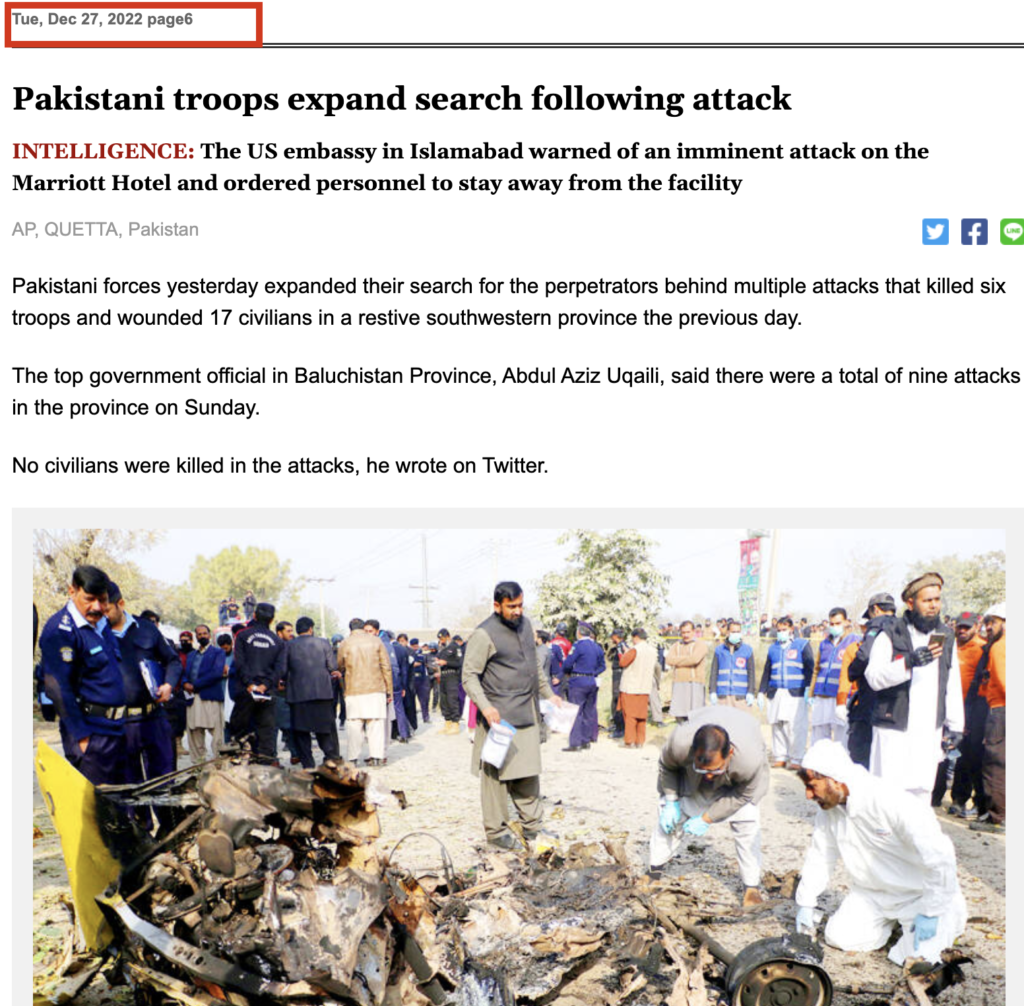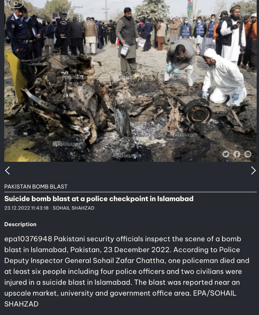 मिली जानकारी की मदद लेते हुए अधिक सर्च करने पर वायरल तस्वीर की खबर हमें अन्य कई मीडिया रिपोर्टस में मिली।जिसे यहां,यहां और यहां पर देखा जा सकता है। खबरों के अनुसार 23 दिसंबर 2022 को इस्लामाबाद में एक आत्मघाती हमला हुआ, जब संदिग्ध कार को रोकने पर उसमें सवार हमलावर ने खुद को उड़ा लिया। इस हमले में एक पुलिसकर्मी की मौत हो गई, जबकि चार पुलिसकर्मियों समेत कम से कम छह लोग घायल हुए हैं।