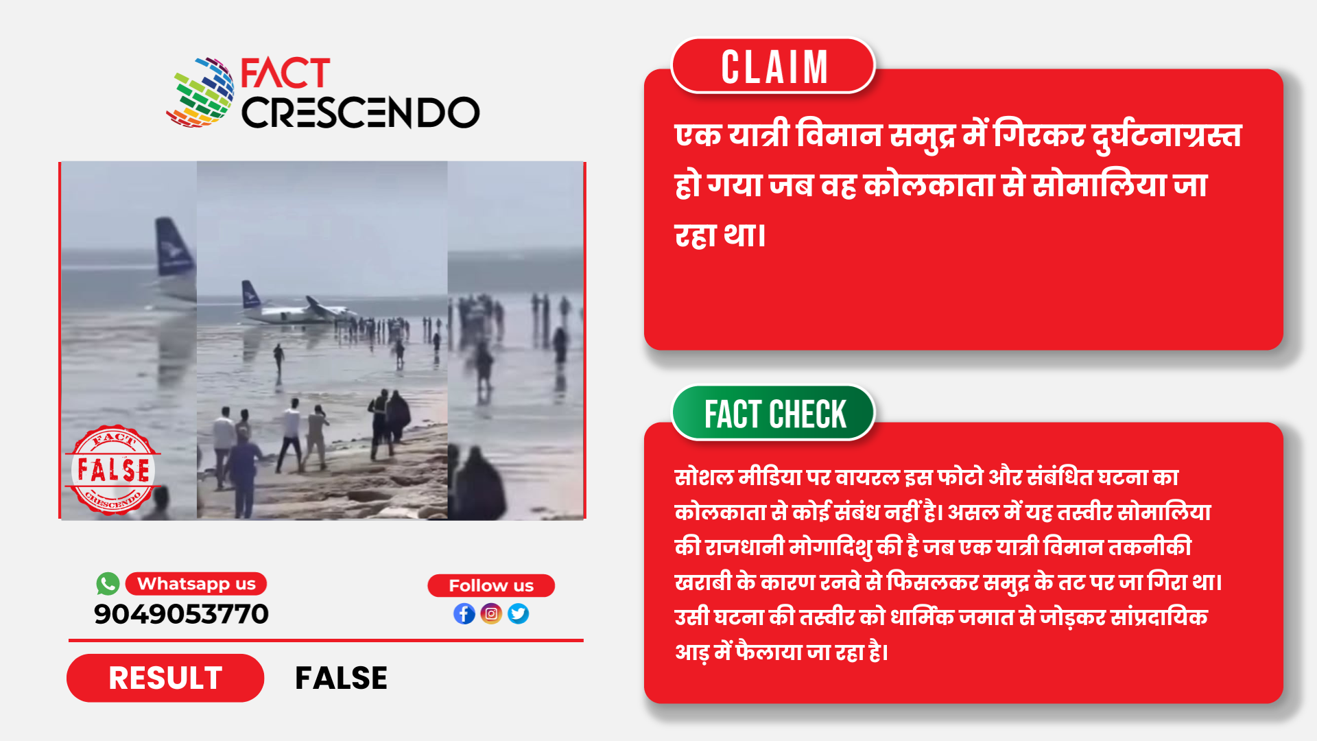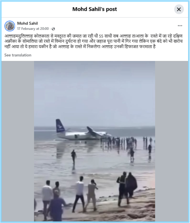हमें मिले साक्ष्यों द्वारा यह पुष्टि होती है कि वायरल तस्वीर के साथ किया जा रहा दावा भ्रामक है। इस तस्वीर का कोलकाता और किसी विशेष धार्मिक जमात से कोई संबंध नहीं है। असल में यह तस्वीर सोमालिया की राजधानी मोगादिशु की है जब एक यात्री विमान तकनीकी खराबी के कारण रनवे से फिसलकर समुद्र के तट पर जा गिरा था, और उसी समय की घटना की तस्वीर को फर्जी आधार पर फैलाया जा रहा है।
