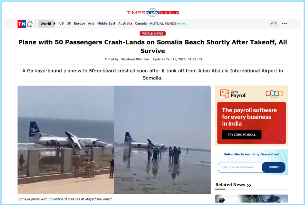 मिली जानकारी से आगे खोज करने पर हमें AP News और इंडिया टीवी की वेबसाइट पर भी रिपोर्ट मिली। इनके अनुसार, यह घटना 11 फरवरी 2026 की है, जब सोमालिया की राजधानी मोगादिशु में स्थित ‘अदन अद्दे इंटरनेशनल एयरपोर्ट’ का एक विमान रनवे से फिसलकर हिंद महासागर के किनारे पानी में जा गिरा था। विमान में चालक दल सहित लगभग 50 से 55 लोग सवार थे। गनीमत यह थी कि विमान गहरे पानी में नहीं डूबा, और सभी यात्रियों को सुरक्षित बाहर निकाल लिया गया।