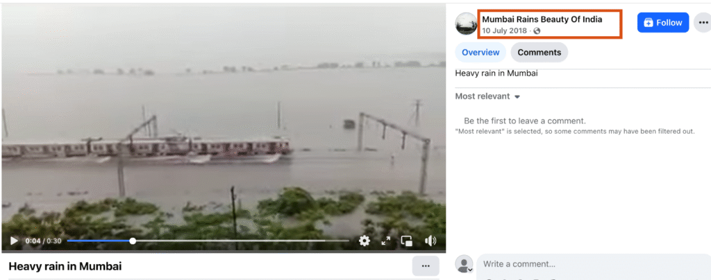 प्राप्त जानकारी के आधार पर हमने गूगल पर संबंधित कीवर्ड्स से सर्च किया। परिणाम में वायरल वीडियो हमें Mumbai Rains Beauty Of India के फेसबुक अकाउंट पर मिला। और यहां पर वीडियो को मुंबई का बताकर 10 जुलाई 2018 को अपलोड किया गया है।