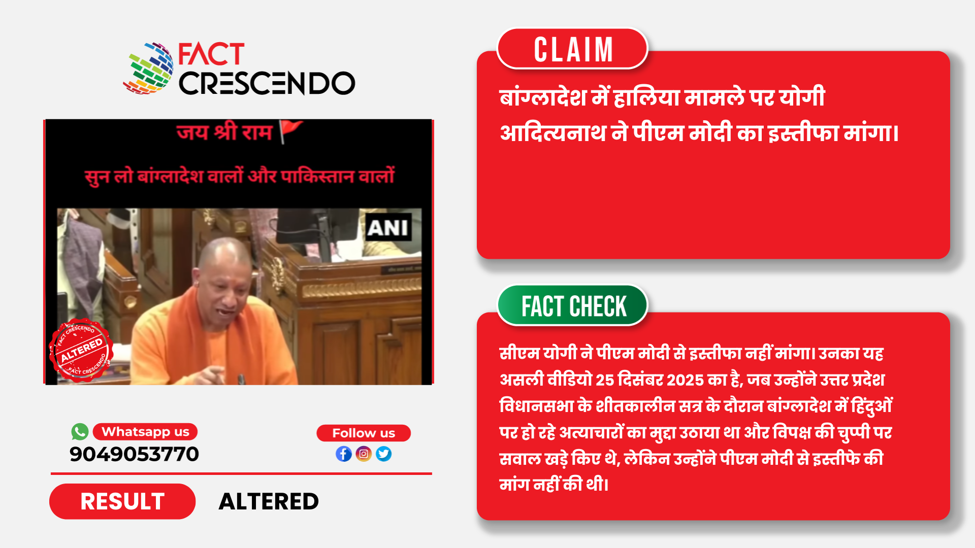 प्रधानमंत्री मोदी से बांग्लादेश पर सीएम योगी ने नहीं की इस्तीफे की मांग, मूल वीडियो से स्पष्ट होता है कि वायरल वीडियो AI निर्मित है।