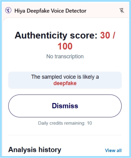 इसकी पुष्टि के लिए हमने एआई वॉइस डिटेक्टर टूल Hiya की मदद से इसे चेक किया। स्पष्ट हुआ कि यह वीडियो वास्तविक नहीं है।