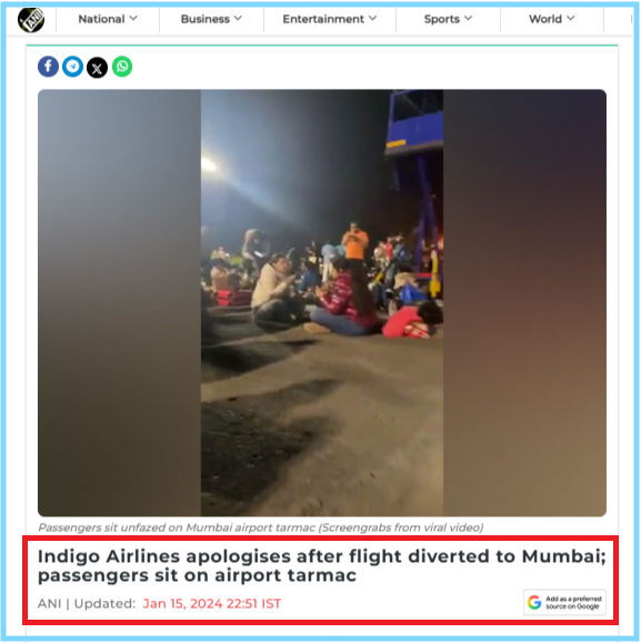 इसके बाद 15 जनवरी 2024 को एएनआई की वेबसाइट पर छपी खबर से पता चला कि, गोवा से दिल्ली जाने वाली फ्लाइट के मुंबई डायवर्ट होने और एयरपोर्ट के रैंप पर यात्रियों के खाना खाने का वीडियो वायरल होने के बाद एयरलाइंस ने इसके लिए माफी मांगी व भविष्य में इस तरह की घटना न हो, इसके लिए कदम उठाए जाने का भरोसा दिया। फ्लाइट को दिल्ली में कम दृश्यता की वजह से मुंबई के लिए डायवर्ट किया गया था।