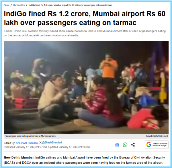 इसी प्रकार से हमें इंडिया टीवी की वेबसाइट पर 17 जनवरी 2024 को छपी रिपोर्ट मिली। जिसके मुताबिक, इंडिगो पर 1.2 करोड़ रुपये का जुर्माना और मुंबई हवाई अड्डे पर 60 लाख रुपये का जुर्माना लगाया गया था, क्योंकि यात्रियों ने रनवे पर खाना खाया था। मुंबई हवाई अड्डे पर यात्रियों के रनवे पर खाना खाते हुए एक वीडियो के सोशल मीडिया पर वायरल होने के बाद केंद्रीय नागरिक उड्डयन मंत्रालय ने इंडिगो और मुंबई हवाई अड्डे को कारण बताओ नोटिस जारी किया था।