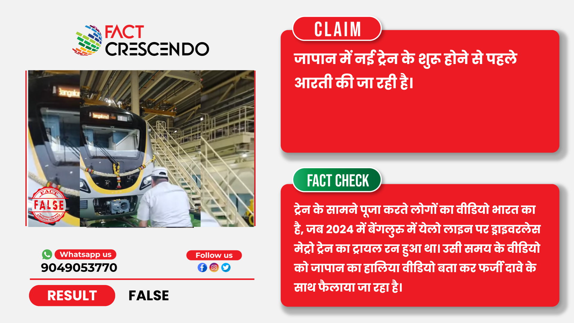 तथ्यों के जांच से यह पता चलता है कि ट्रेन के सामने पूजा करते लोगों का वीडियो भारत का है, जापान का नहीं है। यह वीडियो 2024 का है जब बेंगलुरु में येलो लाइन पर ड्राइवरलेस मेट्रो ट्रेन का ट्रायल रन हुआ था। इसलिए वायरल दावा फर्जी है।