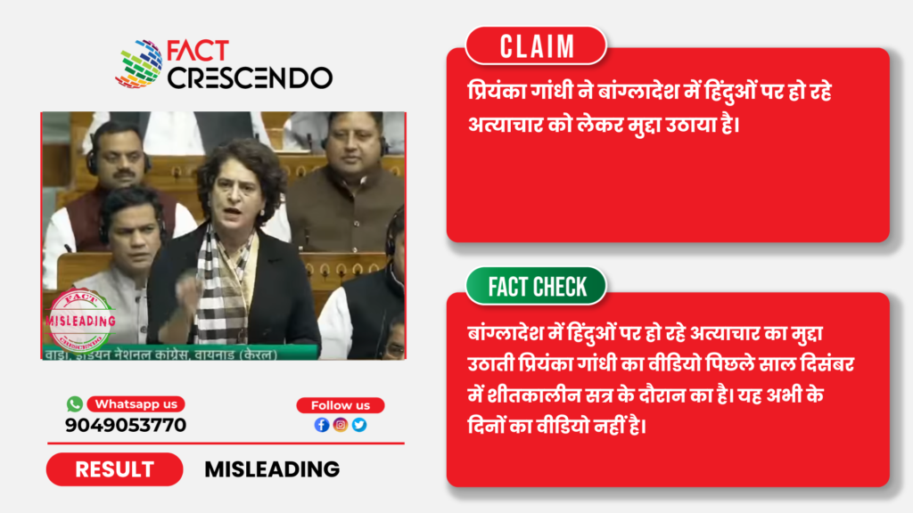 तथ्यों के जांच से यह पता चलता है कि बांग्लादेश में अल्पसंख्यकों के खिलाफ हो रही हिंसा पर अपनी बात कहती कांग्रेस सांसद प्रियंका गांधी का वीडियो हालिया नहीं बल्कि, पिछले साल संसद के शीतकालीन सत्र के दौरान का है। इसका हालिया संदर्भ से कोई संबंध नहीं है।
