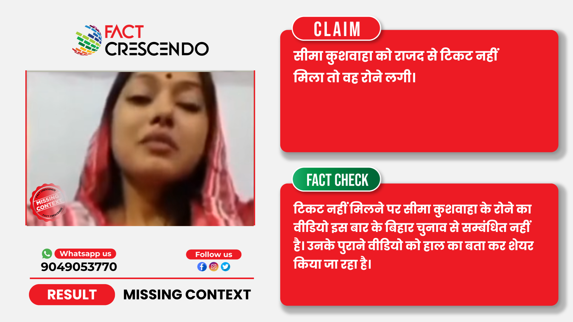 तथ्यों के जांच से यह पता चलता है कि सीमा कुशवाहा के वायरल वीडियो के साथ किया जा रहा दावा गलत है। यह वीडियो हालिया नहीं है बल्कि साल 2020 का है जब वे उपेंद्र कुशवाहा की पार्टी रालोसपा से टिकट नहीं मिलने पर भावुक हो कर रोती हुई दिखाई दी थीं। उनके उसी पुराने वीडियो को अभी का बता कर भ्रामक दावा किया गया है।