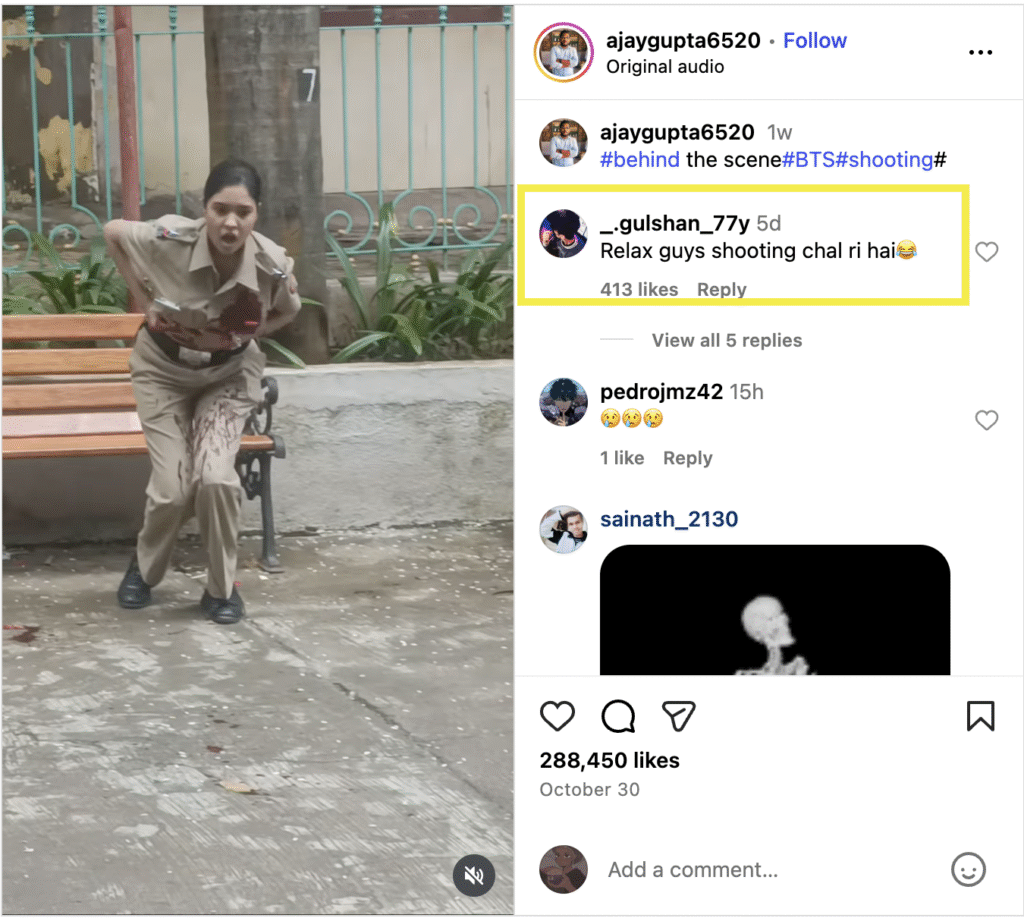 पड़ताल की शुरुआत में हमने वायरल वीडियो के तस्वीरों का रिवर्स इमेज सर्च किया । परिणाम में वायरल वीडियो की क्लिप हमे ajay gupta नाम के इंस्टाग्राम यूजर की अकाउंट पर मिली। जिसके कैप्शन में ‘#behind the scene#BTS#shooting#’ लिखा हुआ था।
