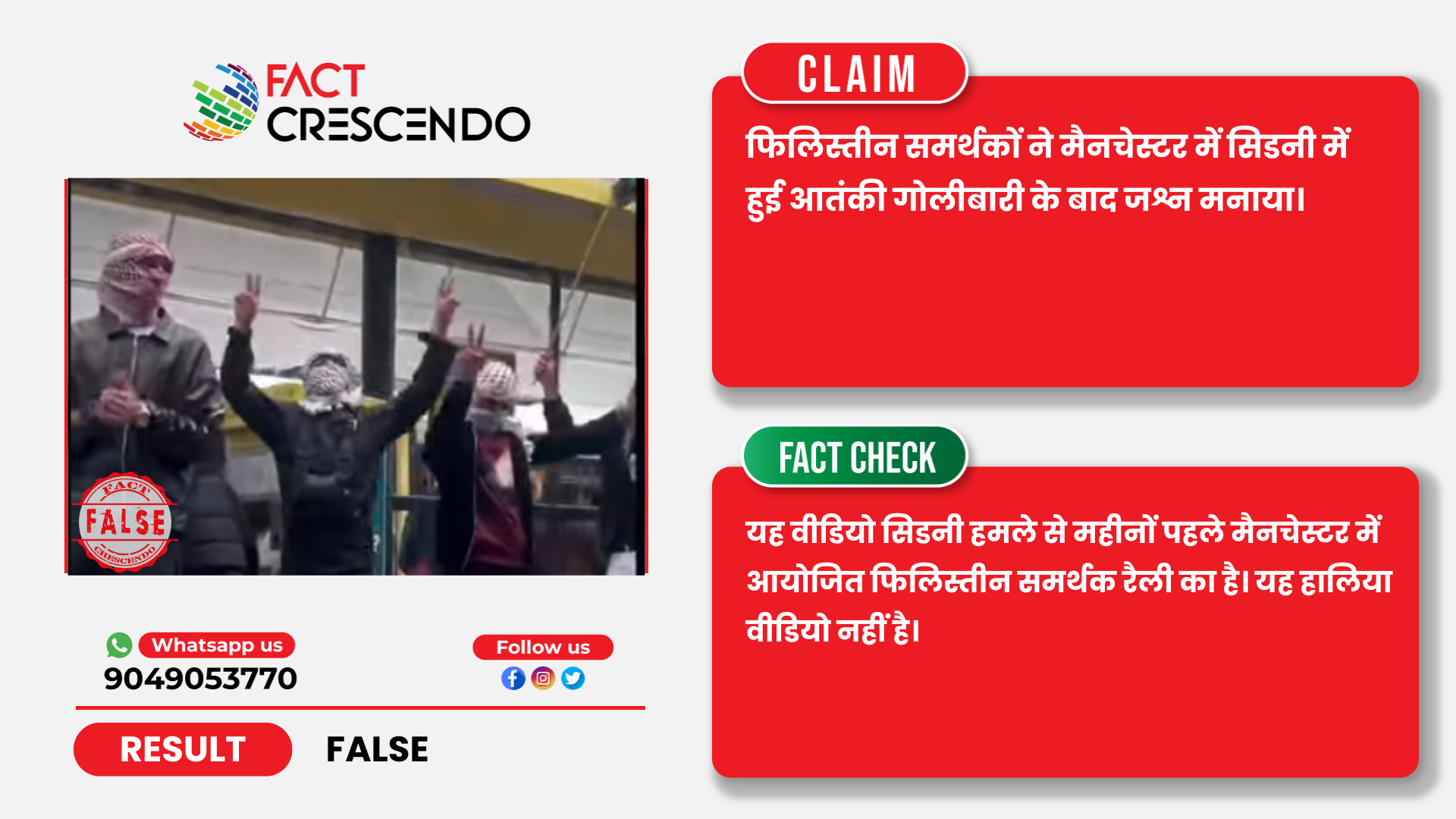 तथ्यों के जांच से यह पता चलता है कि, मैनचेस्टर में फिलिस्तीन समर्थक रैली के एक पुराने वीडियो को सिडनी में हालिया आतंकवादी हमले के समर्थन में आयोजित रैली का बता कर भ्रामक दावे से फैलाया जा रहा है।