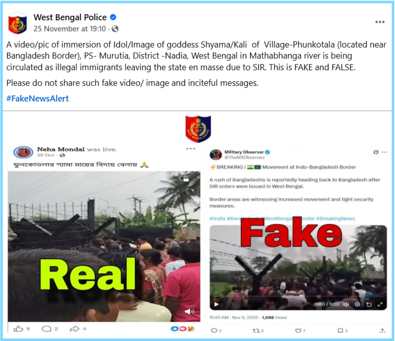 यहीं पोस्ट पश्चिम बंगाल पुलिस द्वारा उनके आधिकारिक फेसबुक पेज पर भी साझा किया हुआ देखा जा सकता है। वायरल दावे का खंडन करते हुए यह बताया गया है कि,बांग्लादेश सीमा के पास पश्चिम बंगाल के नदिया जिले के मुरुतिया थाने के अंतर्गत आने वाले गांव फुनकोटाला में काली विसर्जन के वीडियो को इस दावे से शेयर किया जा रहा है कि, SIR के कारण अवैध प्रवासी बड़े पैमाने पर राज्य छोड़ रहे हैं। यह दावा पूरी तरह से भ्रामक है।