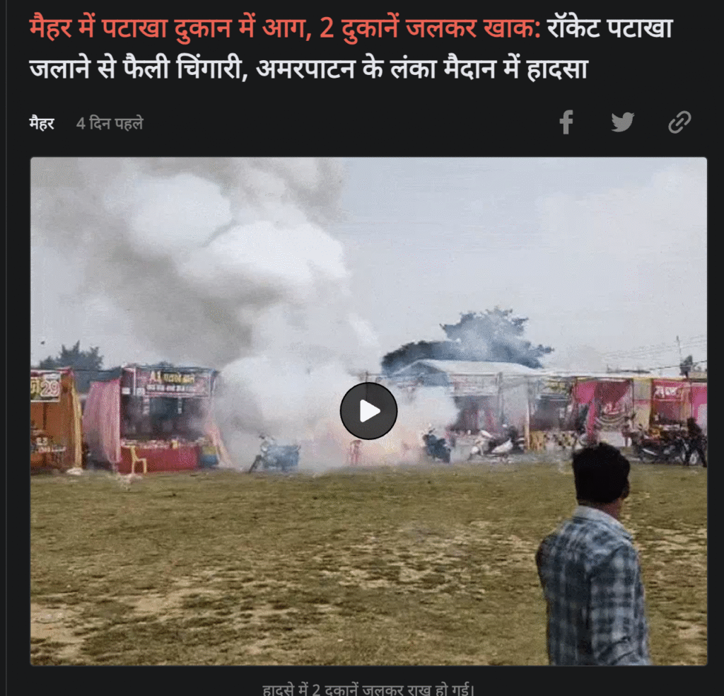 पड़ताल की शुरुआत में हमने वायरल वीडियो के तस्वीरों का रिवर्स इमेज सर्च किया। परिणाम में वायरल वीडियो की खबर हमें NDTV MP Chhattisgarh के यूट्यूब चैनल पर मिली। 19 अक्टूबर को इससे संबंधित वीडियो न्यूज को देखा जा सकता है। जिसके अनुसार, एमपी के मैहर जिले के लंका मैदान के पास पटाखों की दुकानों में 19 अक्टूबर को आग लगने से चार दुकानों में रखे पटाखे जल गए।