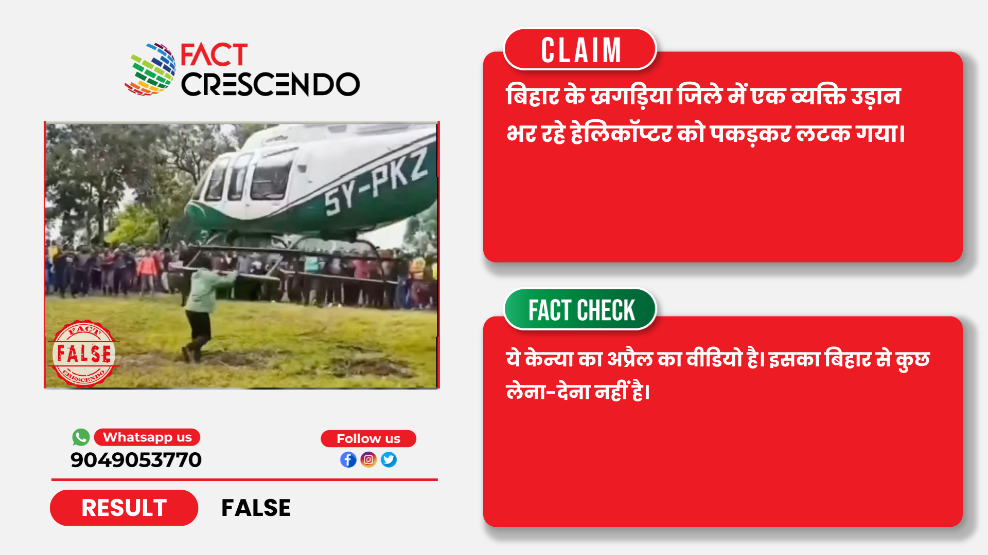 निष्कर्ष- तथ्य-जांच के बाद हमने पाया कि, हेलीकाप्टर से लटके शख्स का वायरल वीडियो यह केन्या का है। इसका बिहार से कुछ लेना-देना नहीं है।