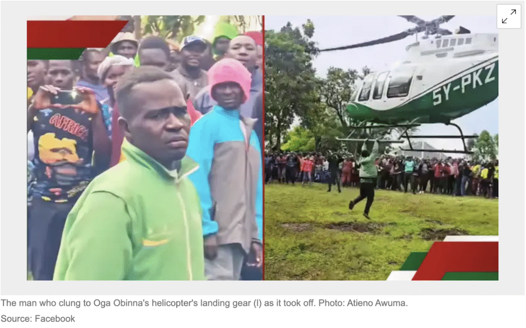 केन्या के अन्य न्यूज आउटलेट टुको ने 13 अप्रैल 2025 को हेलिकॉप्टर से लटकने वाले इस शख्स स्टीफन की तस्वीर भी छापी थी।