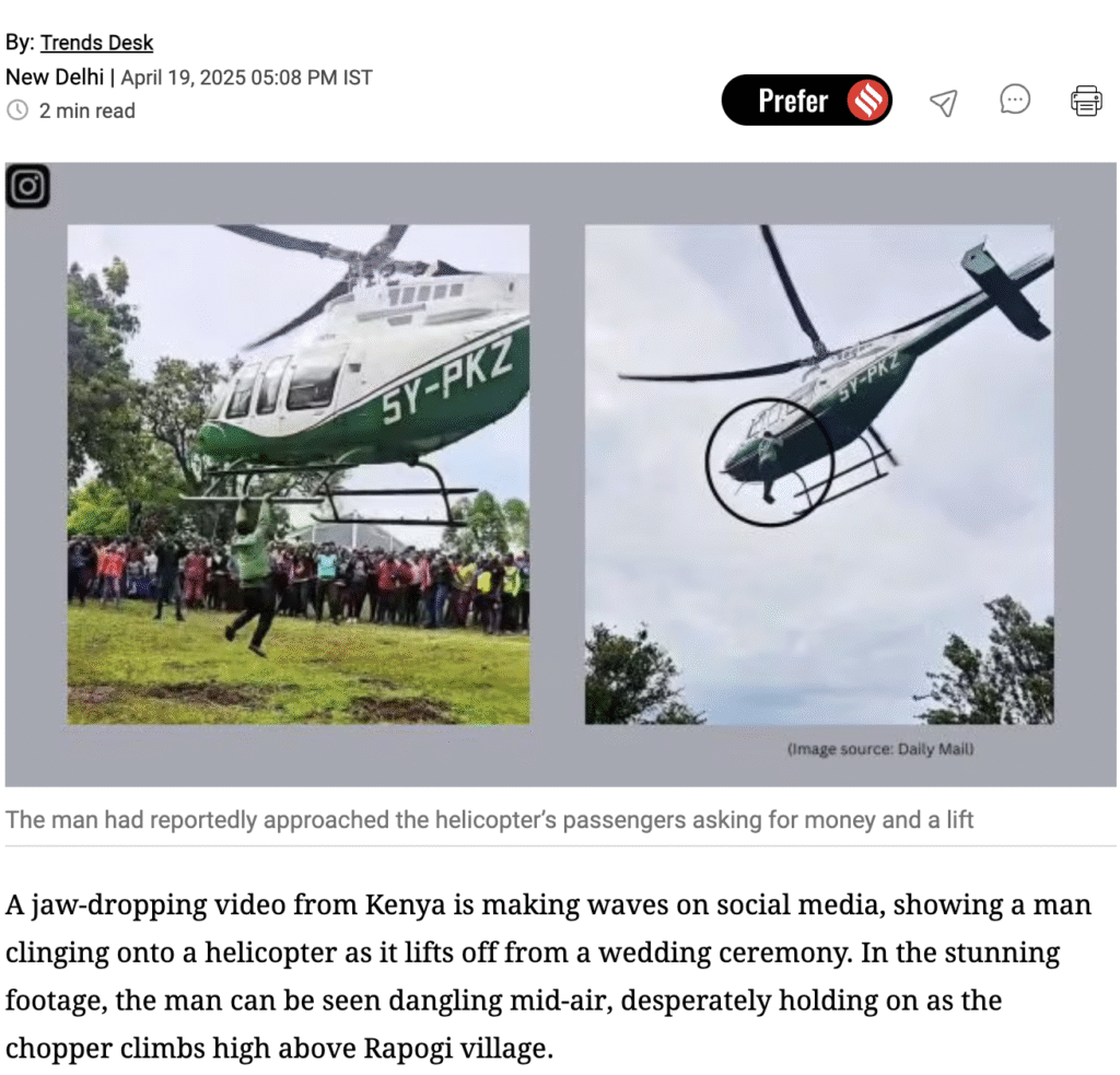 इसके अलावा वायरल वीडियो इंस्टाग्राम हैंडल “ट्रैवल” द्वारा अपलोड किया गया था। वीडियो के विस्तारित संस्करण में कई अफ़्रीकी लोग दिखाई दे रहे हैं, जो उस जगह की पुष्टि कर रहे हैं। 18 अप्रैल 2025 को पोस्ट की गई इस पोस्ट का कैप्शन था, “केन्या में एक व्यक्ति को एक शादी से घर लौटने के लिए लिफ्ट न मिलने पर हेलीकॉप्टर के किनारे से चिपके हुए रिकॉर्ड किया गया।”