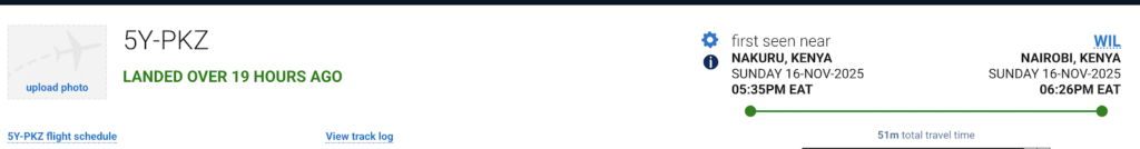 इसके अतिरिक्त, जब हमने फ्लाइटराडार24 वेबसाइट पर 5Y-PKZ की हालिया उड़ान गतिविधि की समीक्षा की, तो पाया कि इसके सभी हालिया ऑपरेशन नैरोबी, केन्या में दर्ज किए गए थे, जिससे पुष्टि हुई कि हेलीकॉप्टर वहीं स्थित है।