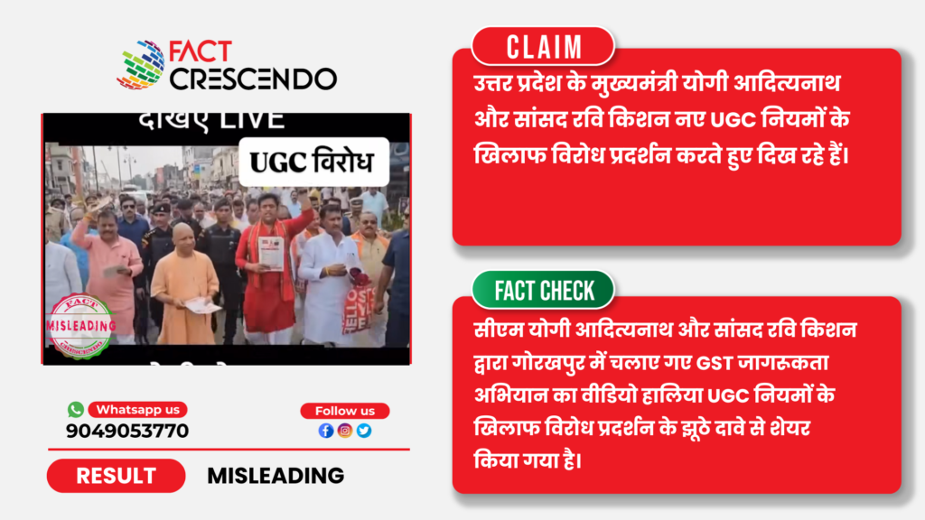निष्कर्ष- तथ्य-जांच के बाद हमने पाया कि, सीएम योगी आदित्यनाथ और सांसद रवि किशन द्वारा गोरखपुर में चलाए गए GST जागरूकता अभियान का वीडियो हालिया UGC नियमों के खिलाफ विरोध प्रदर्शन के झूठे दावे से शेयर किया गया है।