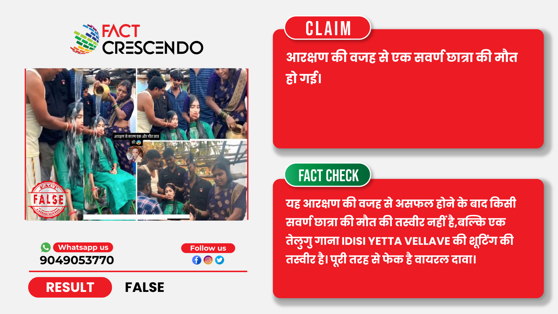 तथ्यों के जांच से यह पता चलता है कि वायरल हो रही तस्वीर के साथ किया जा रहा दावा गलत है। असल में यह तस्वीर आरक्षण की वजह से किसी सवर्ण छात्रा की मौत का नहीं है, बल्कि यह एक तेलुगु गाने IDISI YETTA VELLAVE की शूटिंग की तस्वीर है।