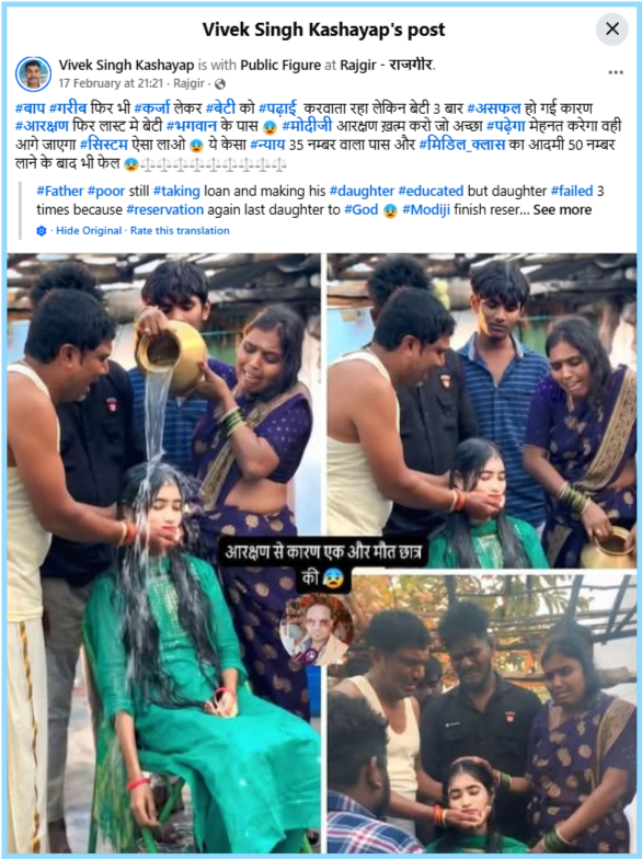 देश में आरक्षण के मुद्दे से जोड़ते हुए एक पोस्ट वायरल किया जा रहा है। इसमें एक तस्वीर दिखाई दे रही है,जिसमें एक लड़की हरे रंग के कपड़े पहने कुर्सी पर अचेत अवस्था में बैठी है और एक महिला के साथ रोते-बिलखते परिजन उस लड़की को नहाते हुए दिख रहे हैं। इस तस्वीर को साझा करने वाले यूज़र का दावा है कि इसमें दिख रही लड़की एक स्वर्ण जाति की है जो जातिवादी आरक्षण के चलते मौत के हत्थे चढ़ गई।तस्वीर को इस कैप्शन के साथ साझा किया जा रहा है…